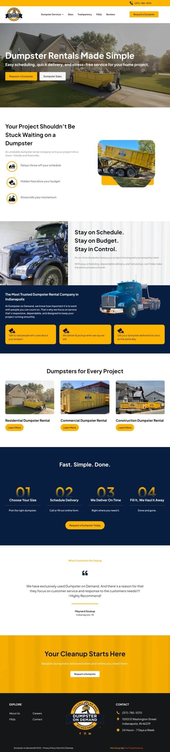 First, we started with redesigning their website. When we first started working with Dumpster on Demand, they were being recognized as the #1 dumpster rental company in Indianapolis, and they need a website that could keep up. We gave them a responsive, user-friendly site, as well as cranked out pages full of optimized content. The traffic to their site increased, and so did the amount of leads they were getting. Since then, we’ve continued with our Content Marketing plan, as well as focused our efforts on creating online directory sites with our Local Search Optimization plan in place. We’re so excited to see Dumpster on Demand continue to grow and succeed!